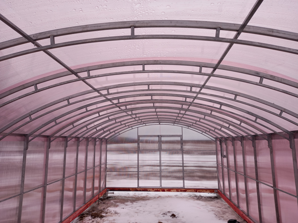 • широкая 4 м, ширина теплицы позволяет организовать 3 широкие полноценные грядки с комфортными проходами между ними;