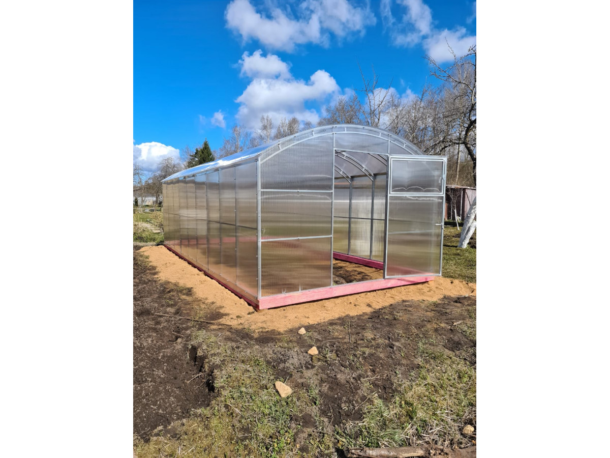 Возможна самостоятельная сборка по подробной инструкции. Сборка теплицы монтажниками-профессионалами компании занимает порядка 3 часов. В качестве основания рекомендуется использовать бетонный, либо деревянный фундамент из бруса. Предварительно брус необходимо обработать антисептиком. Полный комплект состоит из: